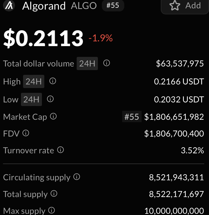 Algorand's max supply is 10B ALGO, with a current circulation nearing 9B. ALGO is close to its maximum supply, meaning there is limited room for further supply increase, which could affect its long-term price stability. With 90% of ALGO’s 10B max supply already circulating, the lack of deflationary burns contrasts and sustained selling pressure from staking rewards could suppress price growth.